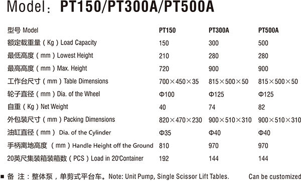 型号 | PT150 | PT300A | PT500A |